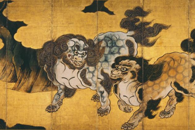 Kano Eitoku (1543–1590); Chinese Lions; 16th century; six-panel folding screen; ink and color on gold; Imperial Household Collection.