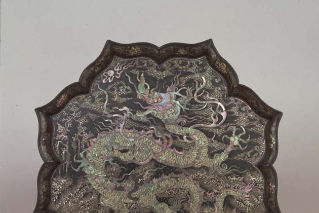 Mother-of-pearl inlaid lacquer tray decorated with a dragon chasing a flaming pearl amid crashing waves; China, Yuan period (1206-1368), d. 33.0 cm; Tokyo National Museum.