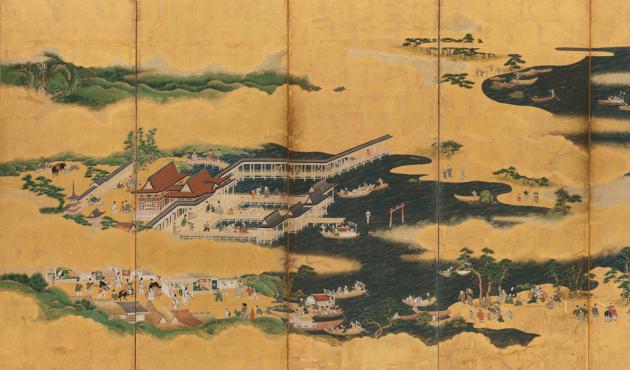 Detail from Views of Scenic Sites Itsukushima and Wakanoura Shrines; Edo period, pair of six-panel folding screens, ink and color on gold leaf; Santa Barbara Museum of Art.